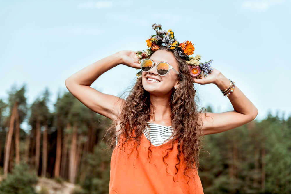 Boho-inspired styles are still on trend, and frizzy hair topped with flowers adheres to this perfectly.