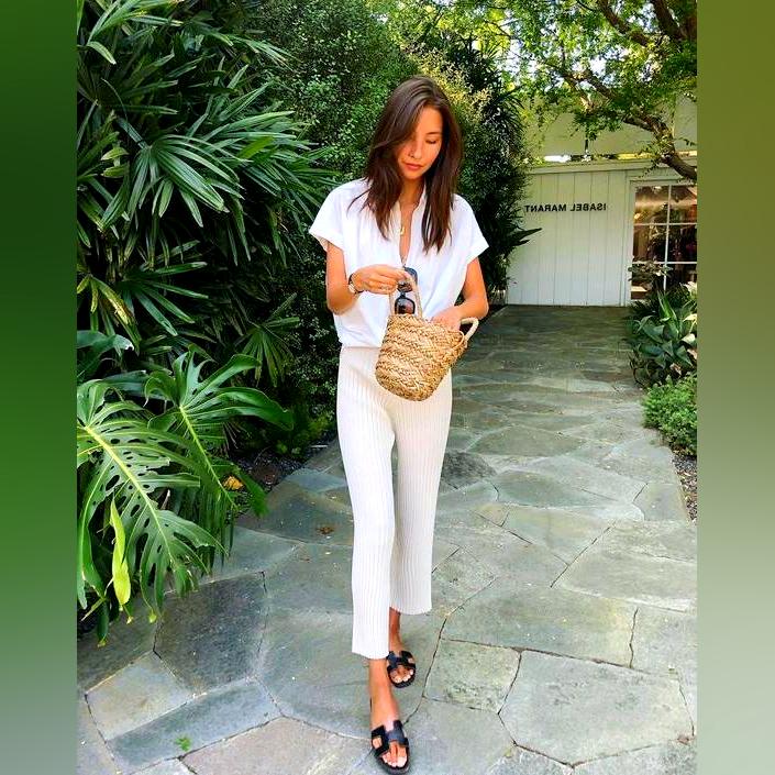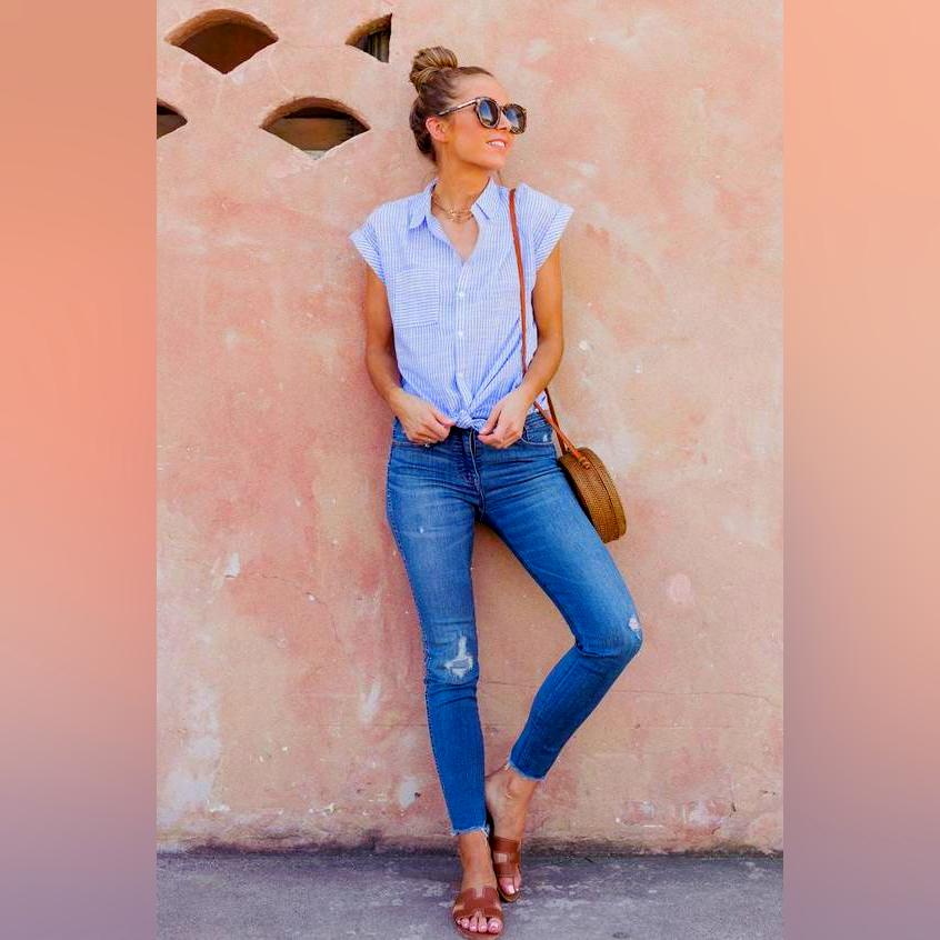 2. An easy t-shirt and white skinny jeans are both fresh and casual looks. If you think wearing another shoes, get yourself a pair of bright color slippers, they’re great options to high heels in summer!
