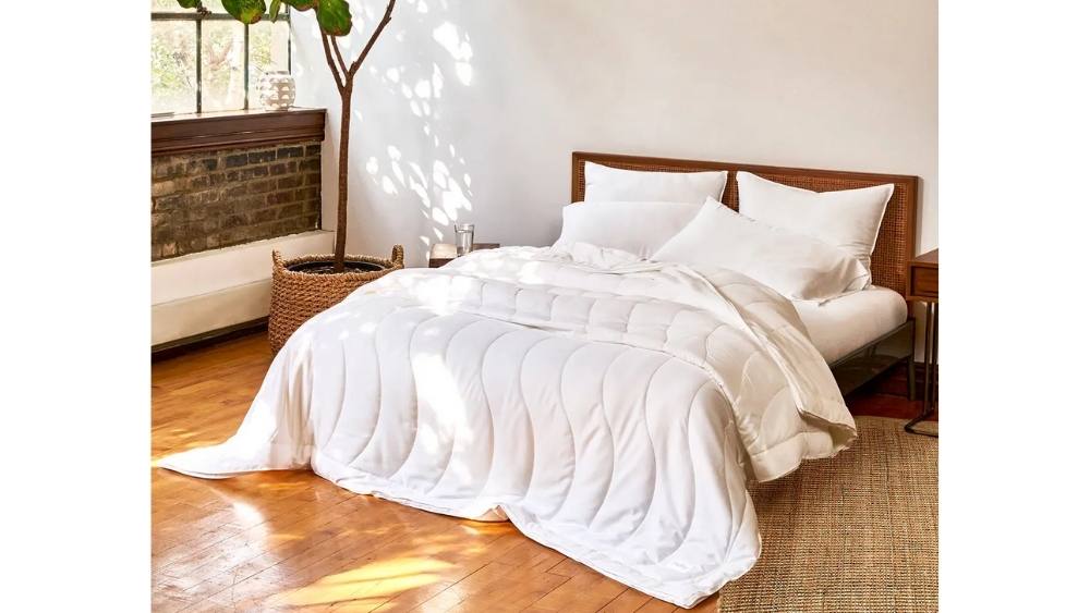If you're one of the many individuals who tend to “sleep hot,” you're probably all too acquainted with the toss- and turn-inducing effects of bedding that's too warm. Throw menopause and sweating into the mix, and becoming a good night's sleep might seem near impossible! Luckily, some blankets are in fact made with you in mind, and also the Buffy Breeze is our pick for the best down alternative comforter with cooling properties. What sets this comforter apart from the rest? To begin with, it's produced from 100 percent eucalyptus fibers (both shell and filling), that are naturally temperature-regulating, cool to the touch, and breathable. I personally love the current wave pattern, which helps elevate the clean white fabric and ensures the filling remains evenly distributed throughout. Plus, this comforter is cruelty-free and OEKO-TEX-certified, meaning you won't have to worry about breathing in any harmful substances.